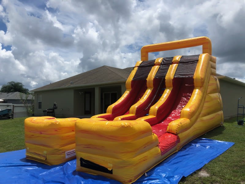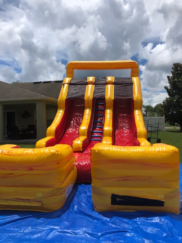 Double lanes for double the fun!!! This 15ft Double Lane Waterslide can be used wet or dry.